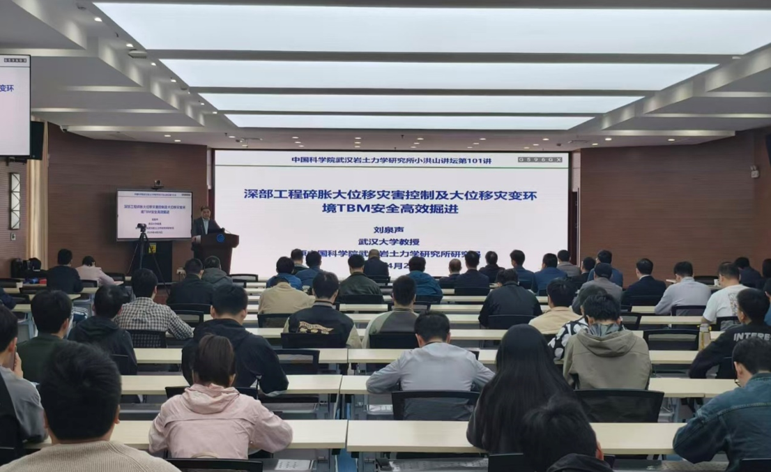 2026年4月20日,中国科学院大学“小洪山讲坛”第101讲在中国科学院武汉岩土力学研究所学术报告厅举行。武汉岩土所杰出校友、中国工程院院士、武汉大学学术委员会副主任刘泉声以《深部工程碎胀大位移灾害控制及大位移灾变环境TBM高效掘进》为题,为师生们带来了一场精彩纷呈的学术报告。报告会由武汉岩土所党委副书记(主持工作)、副所长周辉研究员主持,副所长(主持工作)李邵军研究员为刘泉声院士颁发了“小洪山讲坛”纪念牌,60余名师生参加。