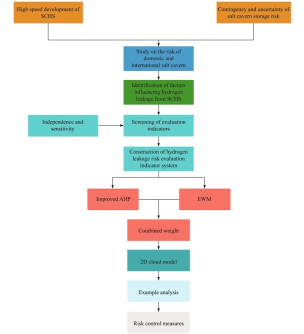 岩土力学与工程安全全国重点实验室油气地下储备与开发研究中心团队围绕盐穴储氢库泄漏风险评价开展研究,系统识别并梳理了影响泄漏的三大类风险因素:地质因素、生化反应因素与工程因素。在此基础上,构建了涵盖(夹层、断层、盖层、化学反应、生物反应、井筒、矿柱、注采频率)等8项指标的泄漏风险评估体系。研究引入云模型,将泄漏发生的概率等级与后果等级作为云模型数字特征,有效表征风险评估过程中普遍存在的模糊性与随机性。同时,采用组合赋权法确定各风险指标权重,克服了传统方法中主观性强或数据依赖度高的缺陷。通过定性与定量相结合的综合评估方法,研究实现了对盐穴储氢库泄漏风险的系统分析与分级判定。